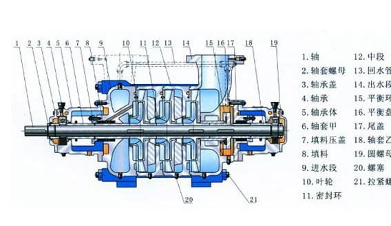 DF型礦用多級泵系臥式、單級、分段式多級離心泵,吸入口為水平方向,吐出口為垂直向上。泵的進水段、中段、出水段等泵殼體部分通過拉緊螺栓聯(lián)結(jié)成一體,并根據(jù)泵的揚程選擇泵的級數(shù)。
